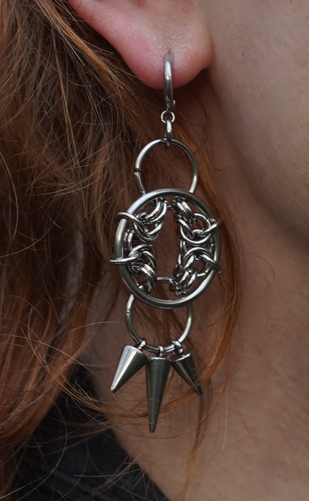 Twin rings form a sanctified axis, bound by woven chainwork like a rosary caught mid-incantation. Below, three polished spikes fall in alignment,. Worn close to the ear, Orison becomes a whispered devotion.